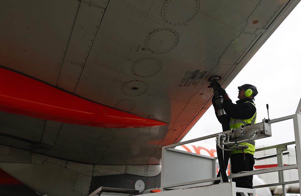A member of the ground crew connects a fuel house to the wing of an aircraft during the refueling process. Fuel accounts for more than one-quarter of airline operational costs. Photographer: Simon Dawson/Bloomberg